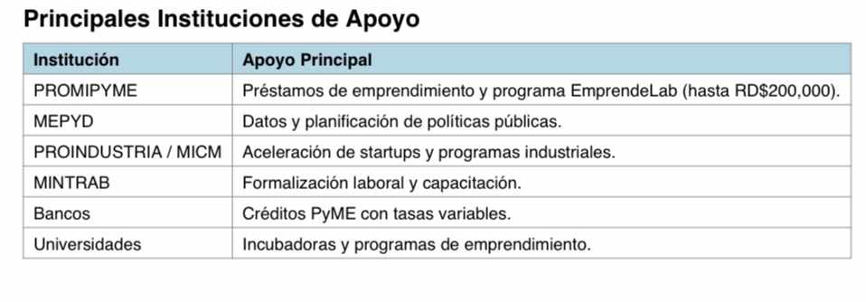 2. Existen programas de apoyo como PROMIPYME (hasta RD$200,000), MEPYD, PROINDUSTRIA y universidades, pero los montos son limitados.